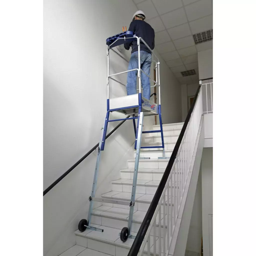 - Veillez placer correctement les pieds de la plateforme, dans les escaliers, en sécurisant votre zone de travail.