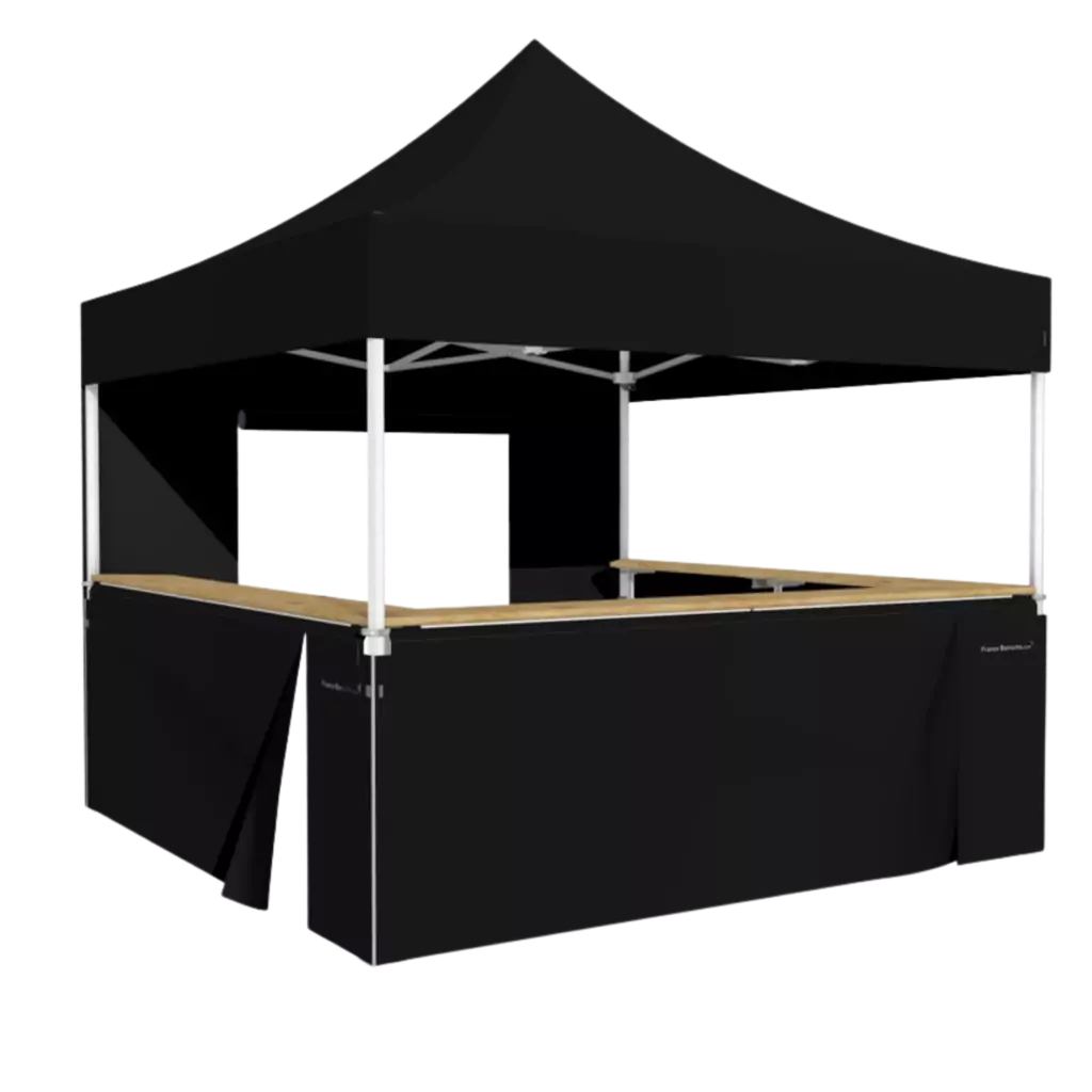 Cette structure de 3 x 3 mètres est équipée de trois comptoirs en bois, offrant un espace de service confortable pour les barmen, les bénévoles ou les organisateurs. Son toit disponible en blanc ou en noir permet de s’adapter au style de votre événement, qu’il soit élégant, festif ou sportif.