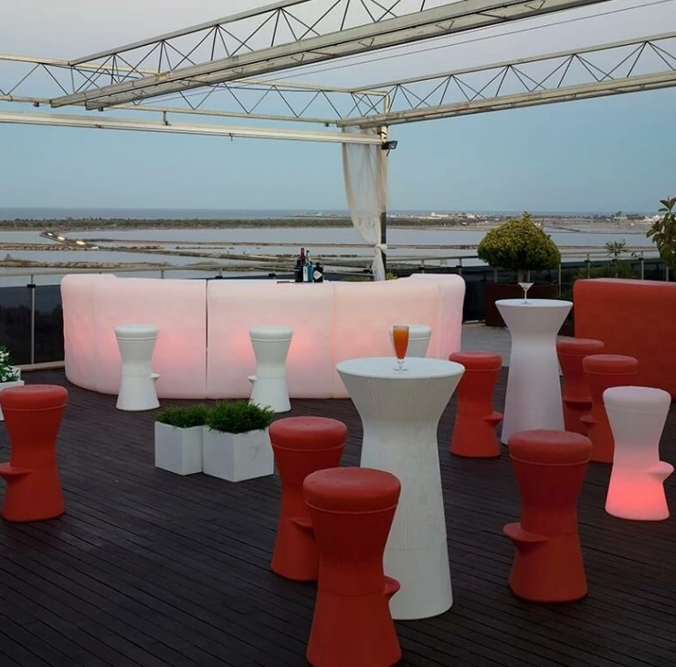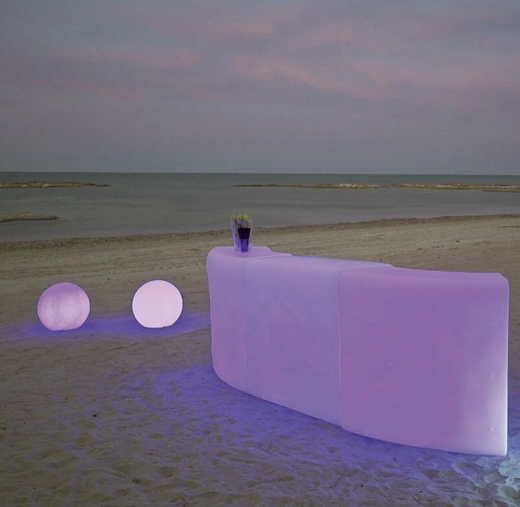Le bar courbé IBIZA est une pièce maîtresse élégante et lumineuse pour sublimer vos événements et soirées, offrant à la fois fonctionnalité et ambiance.