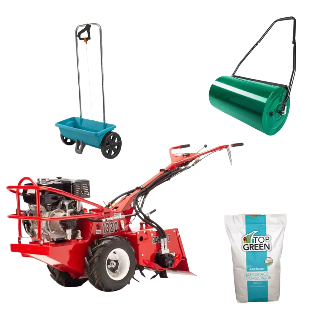 Inclus : un rotovator + rouleau à gazon + semoir + sac gazon création rustique 10kg